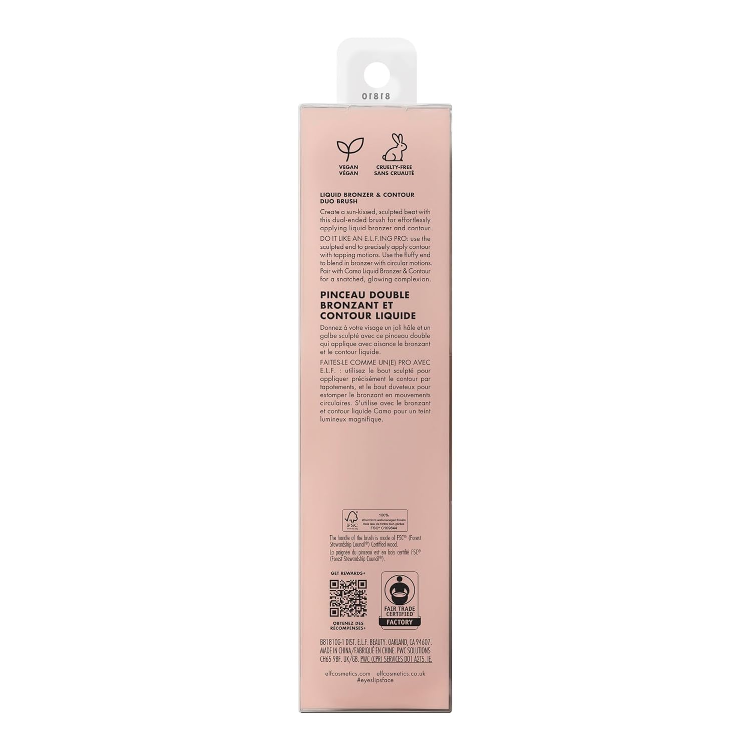 Bronzing and Sculpting: This double-ended facial makeup brush works in conjunction with e.l.f. Camo Liquid Bronzer & Contour, as well as other cream and liquid bronzer eyeshadows, helping you achieve a sun-kissed complexion. Double-ended Makeup Brush: This professional and sturdy makeup brush features a carved end for precise contour application and a soft, fluffy brush for blending and buffing your bronzer. Synthetic Bristles: Our versatile and stylish brush is made with velvet-like synthetic bristles and a sustainably sourced FSC-certified wooden handle. It is gentle to use and won't scratch delicate skin. How to Use: Use the carved end to apply the contour precisely with tapping motions, and use the fluffy end to blend the bronzer in circular motions. Pair it with e.l.f. Camo Liquid Bronzer and Contour to create a captivating, glowing complexion. Vegan and Cruelty-free: 100% vegan, e.l.f. is double-certified by Leaping Bunny & PETA and is non-irritating.
