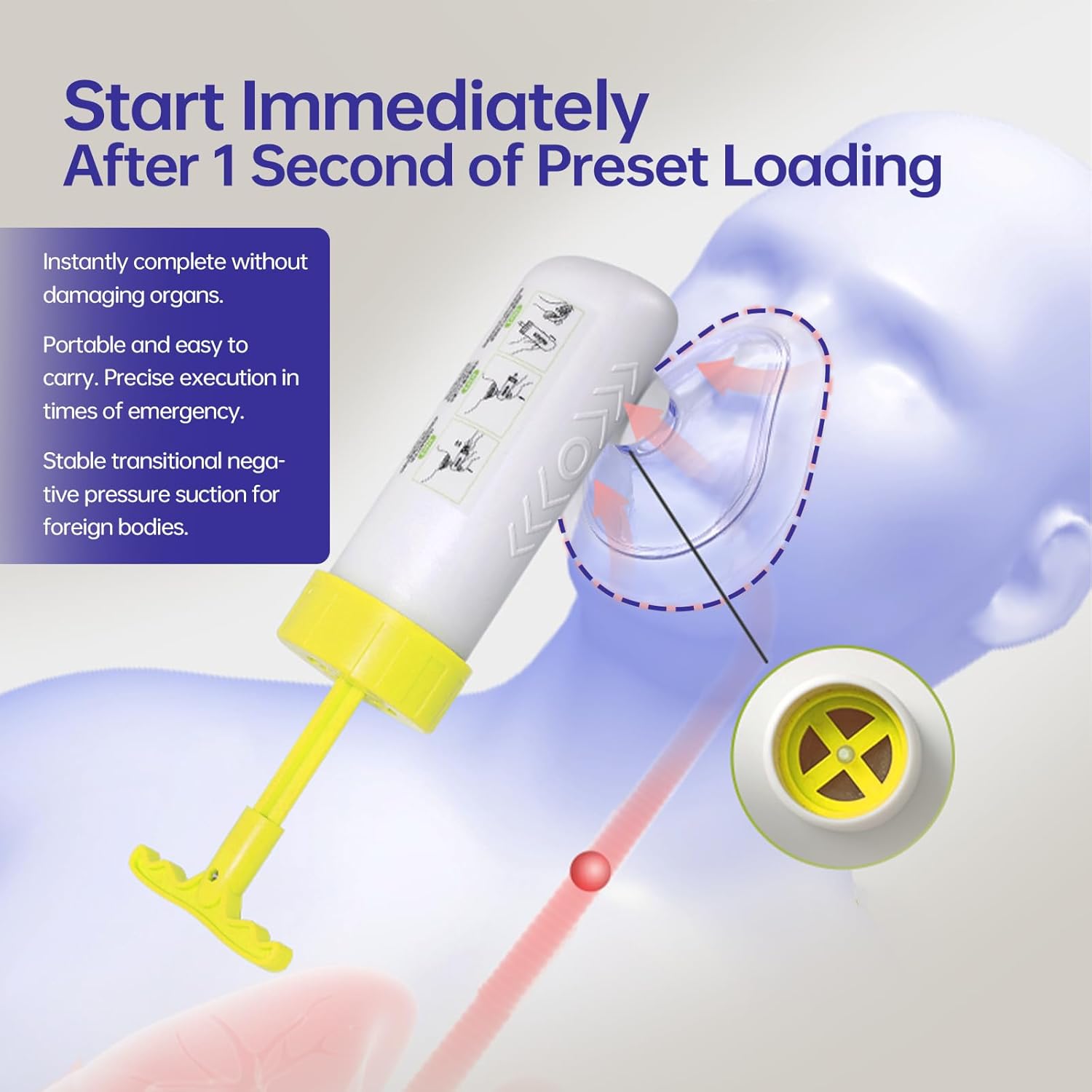 The suction rescue device includes a suction unit with a one-way valve, a pediatric face mask, two adult face masks (one for practical use and one for practice), and a set of instructions. All these items are packed in a durable travel bag. This is a non-invasive suction rescue device designed to save lives in case of airway obstruction. Take action and prepare the appropriate equipment to protect you and your loved ones. The suction device is small, lightweight, and easy to use - it's so simple that you can use it by yourself when choking. They can be carried in a backpack, glove box, or first aid kit and are suitable for home, school, travel, and outdoor use. This kit is suitable for both children and adults. The suction time is extremely short, making it both safe and effective. This suction device can serve as a life-saving tool and play an important role in emergency situations or special cases of airway obstruction. Whether you want to upgrade your first aid kit or just be prepared for any emergency, it will be very useful! There is no need to replace the device unless it has been used to save a life. Check the masks regularly, and it is highly recommended to replace them every two to three years.