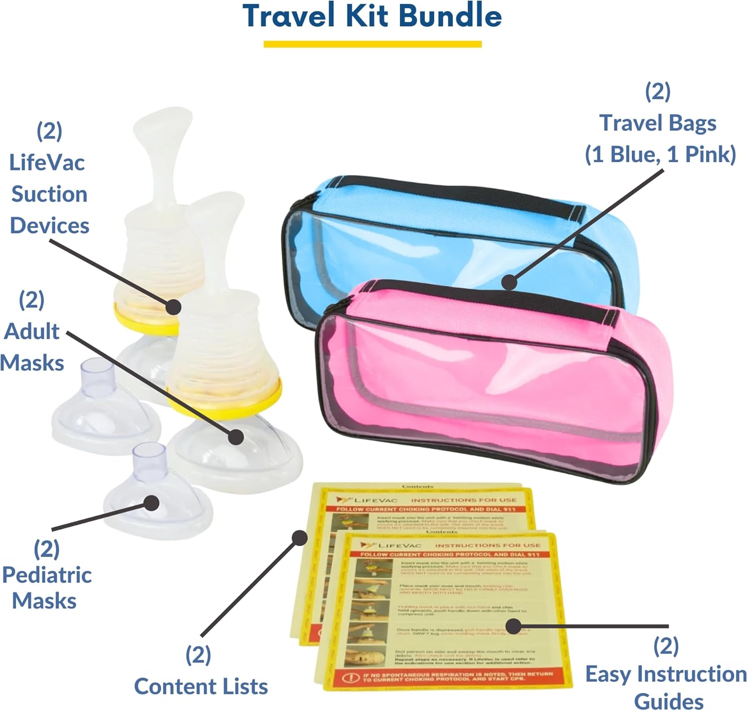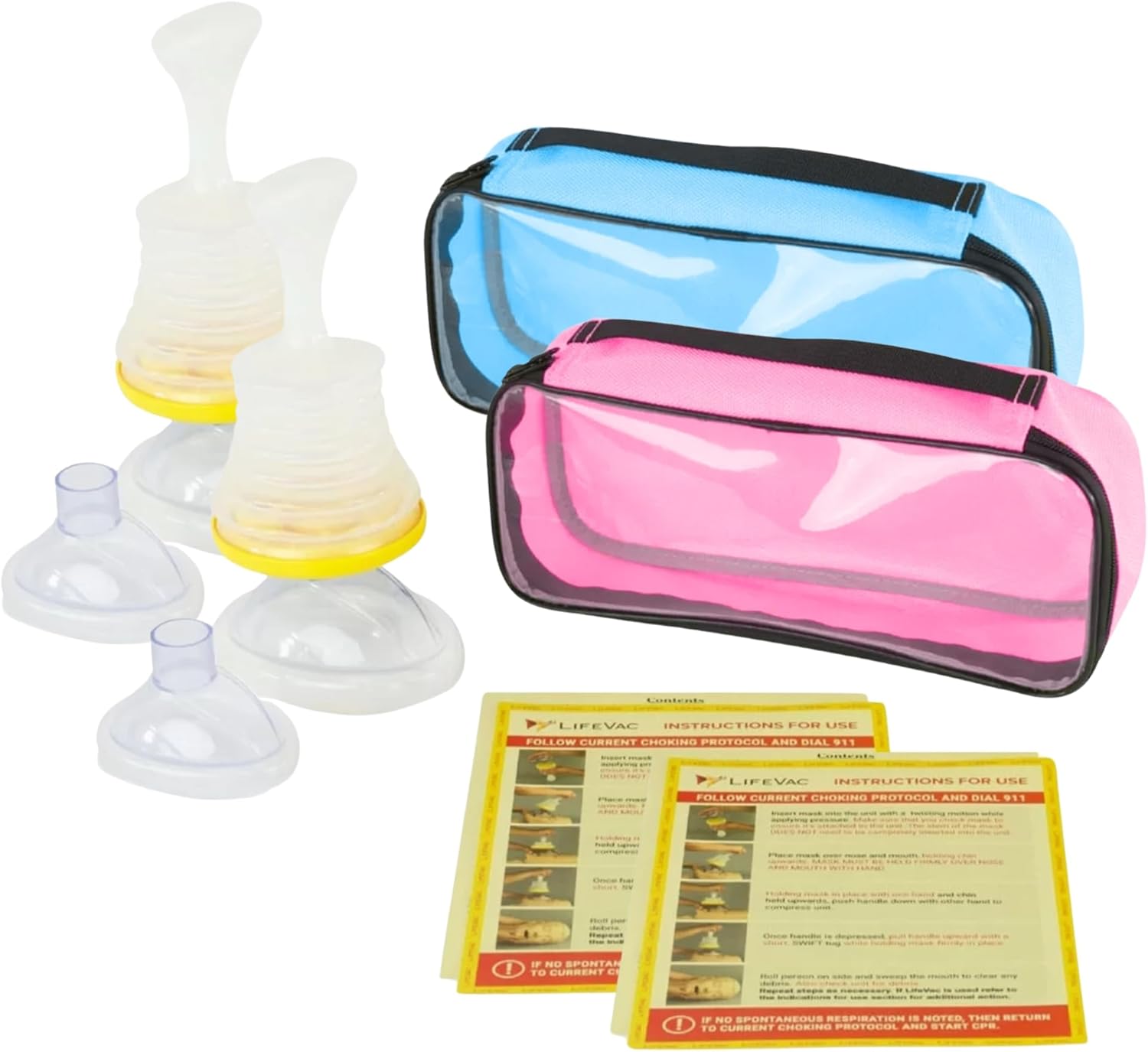 The travel kit, 2-pack includes: (2) LifeVac suction devices, (2) pediatric masks for children and infants, (2) adult masks, (2) transparent zipper bags (1 blue and 1 pink), and (2 sets) of instructions, as well as a "Report a Life Saved" guide. One-way Suction: Registered as a Class II suction device and regulated by the FDA, our patented one-way valve design ensures that the obstruction is removed without forcing it deeper into the airway. Easy to Use: It has a simple three-step operation: place, push, and pull—anyone can use it, and it can even be used for self-rescue in case of choking. Never Expires: Durable and long-lasting, the LifeVac doesn't need to be replaced unless it has been used to save a life. The mask attachments should be checked regularly and replaced every two to three years.