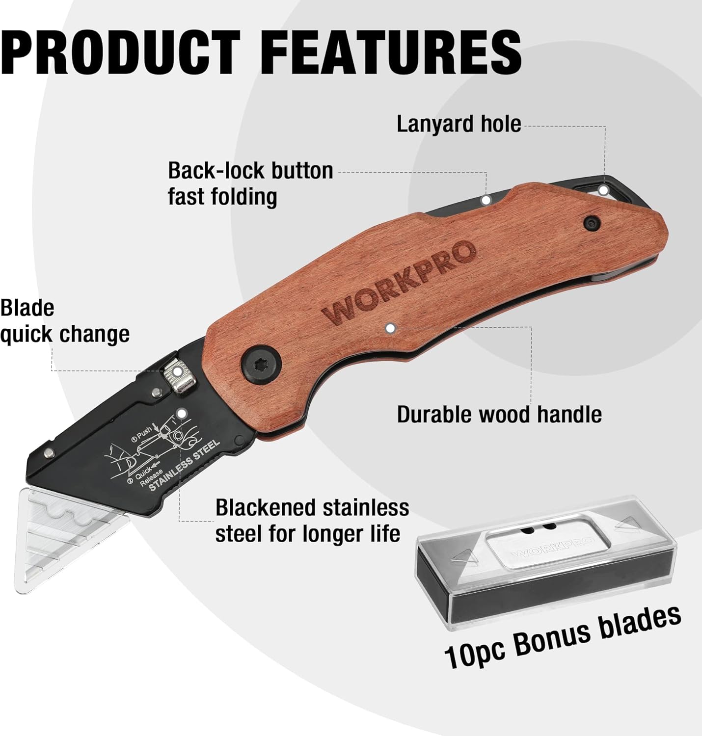 WORKPRO Folding Practical Knife with Stainless Steel Head, Quick Replacement of Blades and Rear Lock, Wooden Handle Heavy Duty Box Knife, 1 Razor Knife with 10 additional SK5 Blades