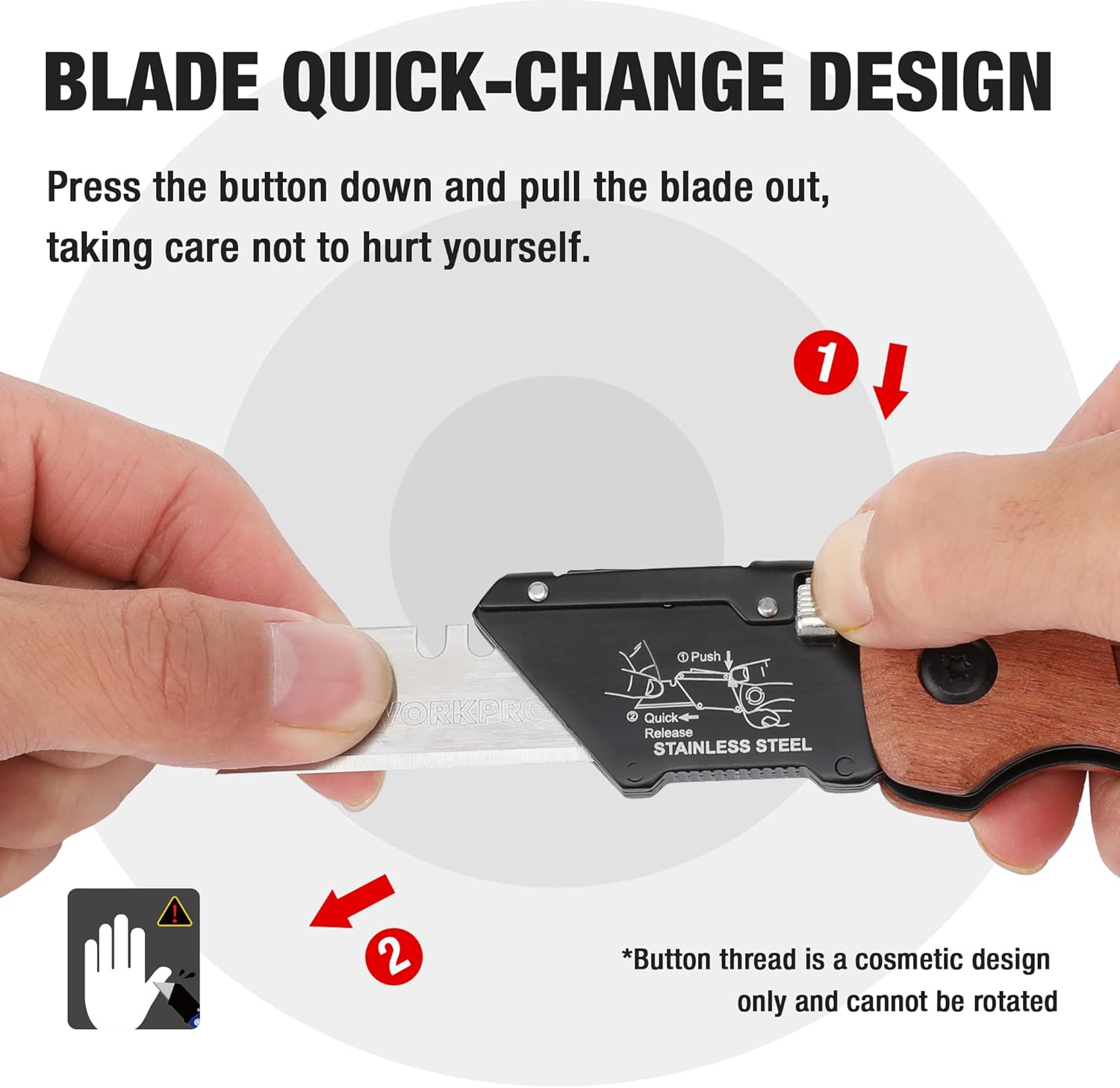 【Pre-purchase】 The wooden handle of this utility knife is made of high-qualitymahogany and has a dark brown texture for a classic retro look. This is a brand newknife with a special design, please don't worry【Quick Replace Blade】 Simply press the button and pull out the blade to easily andsafely replace the blade. Our razors are also compatible with most standard size utilityblades for easy use.includes 10 additional SK5 bladesSafe Use: This heavy duty work knife features an ergonomic handle design for morecomfort. The rear lock design safely keeps the blade in place during use withoutworrying about the blade slipping from the hand during operation【Easy to carry】 Sturdy, sturdy, well-designed folding work knife with belt clips thatcan easily fit in a belt or pocket or bag. You can feel its weight and size, and you willsurely know its existence